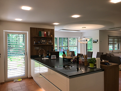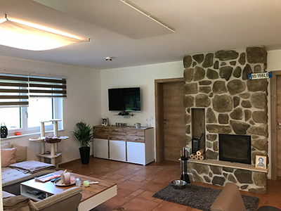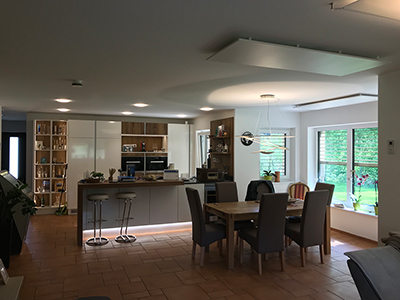 Neben Licht und Beschattung können die Heizkreise, basierend auf Infrarot-Technologie mit evon Smart Home gesteuert werden. Dies kann zeitlich durch Absenkbetrieb erfolgen, wenn die Bewohner das Haus verlassen und durch Komfortbetrieb, bevor sie wieder nach Hause kommen. Wenn die PV-Anlage Überschuss meldet, wird im Winter zusätzlich zu diesen Zeiten die Heizung aktiviert.